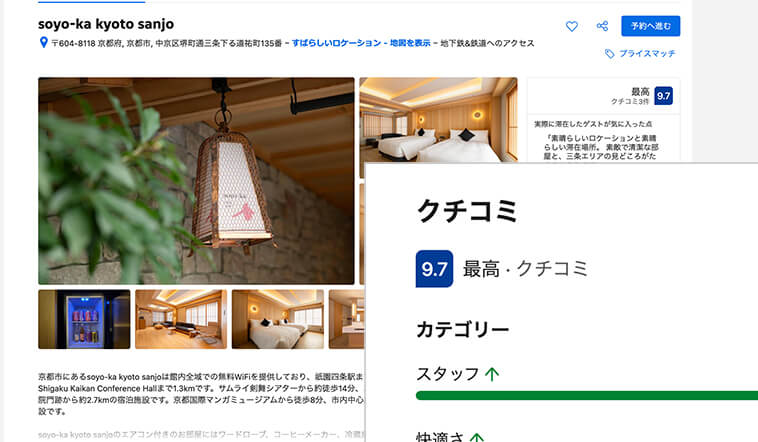 京都にある「soyo-ka」「soyo-ne」は、和モダンでミニマルな意匠と、一般的なホテルよりゆとりある空間設計を備えたアッパー層向けのラグジュアリーホテルです。ハイブランドでありながら省人化を前提とした無人オペレーションを構築し、日々の管理負荷を抑えつつ、レベニューコントロールによって高収益な運営を実現。滞在性への評価も高く、口コミでも好評をいただいており、効率性と上質さを両立した持続性の高い運営モデルを確立しています。